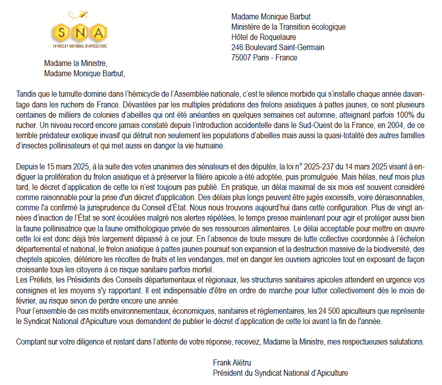 La démarche est simple : photocopiez ou inspirez-vous du courrier ci-dessous pour vous adresser à votre préfet(e), votre député(e), votre sénateur(trice) et lui demander d’interpeller Madame la Ministre de la Transition écologique qui est restée inactive depuis le vote de la loi du 15 mars 2025. Si vous n’agissez pas dans ce sens, c’est que le problème n’est pas si grave !! N’attendez pas que d’autres le fassent pour vous. C’est une déferlante de lettres et de mails que doit générer la filière apicole tout entière. Faites circuler cet appel autour de vous.